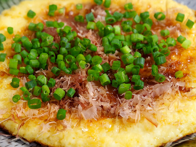 - 器に盛り付け、かつお節とネギを全体に散らし、お好みで市販のウースターソース又は、おしょうゆを付けてお召し上がりください。