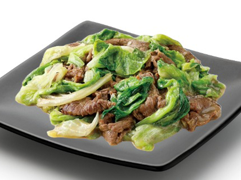 - 牛肉の色が変わったらレタスを加えます。酒を加えてフタをし、1〜2分蒸し焼きにします。